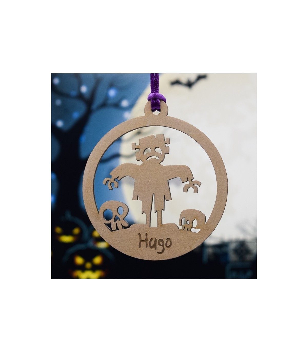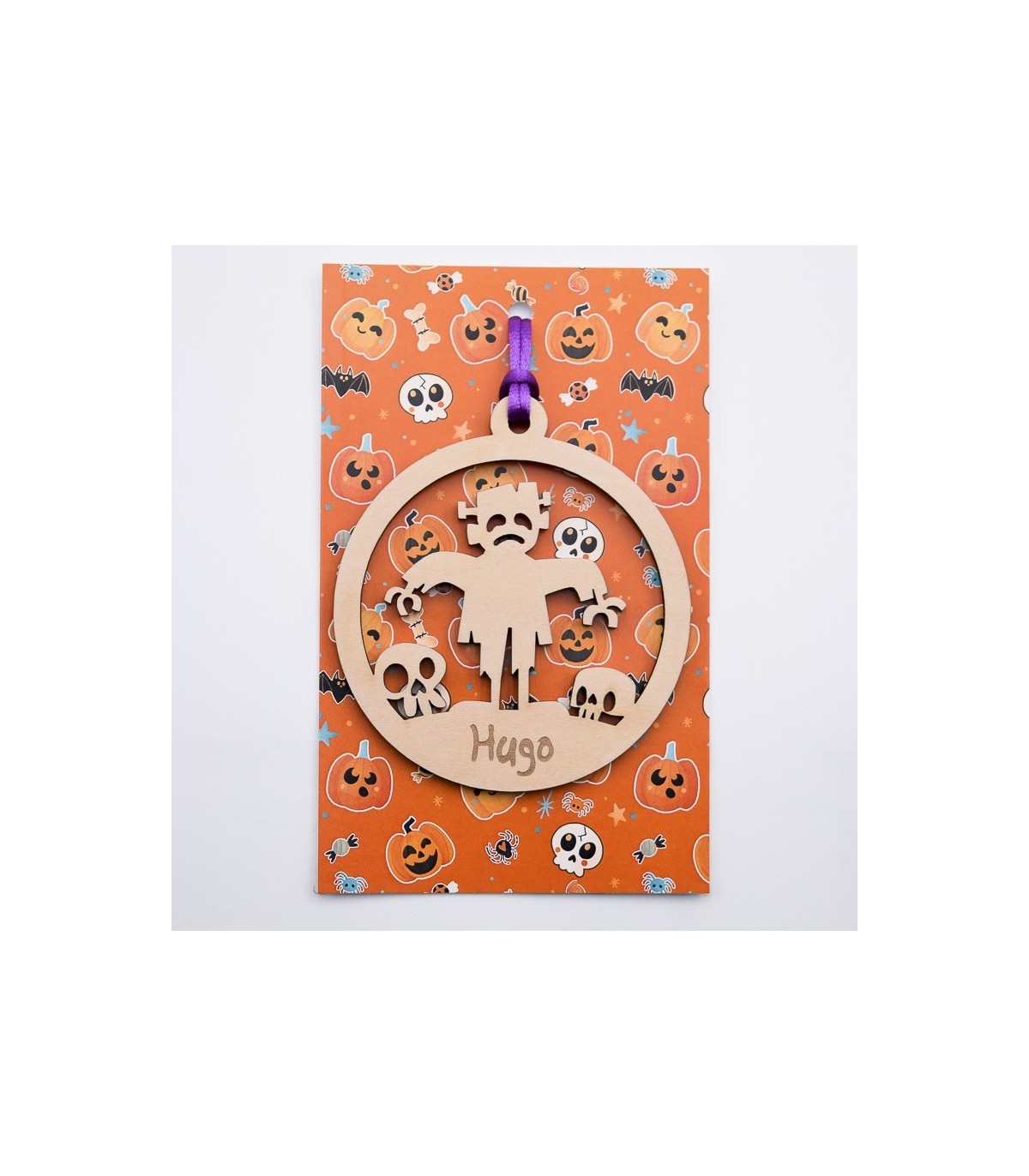 Original adorno de Halloween en madera de abedul, con diseño de monstruo Frankestein y calaveras personalizado con nombre.
