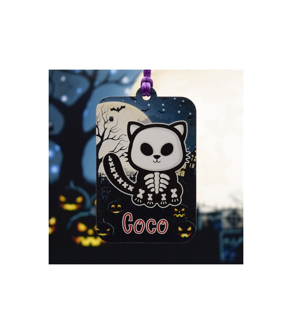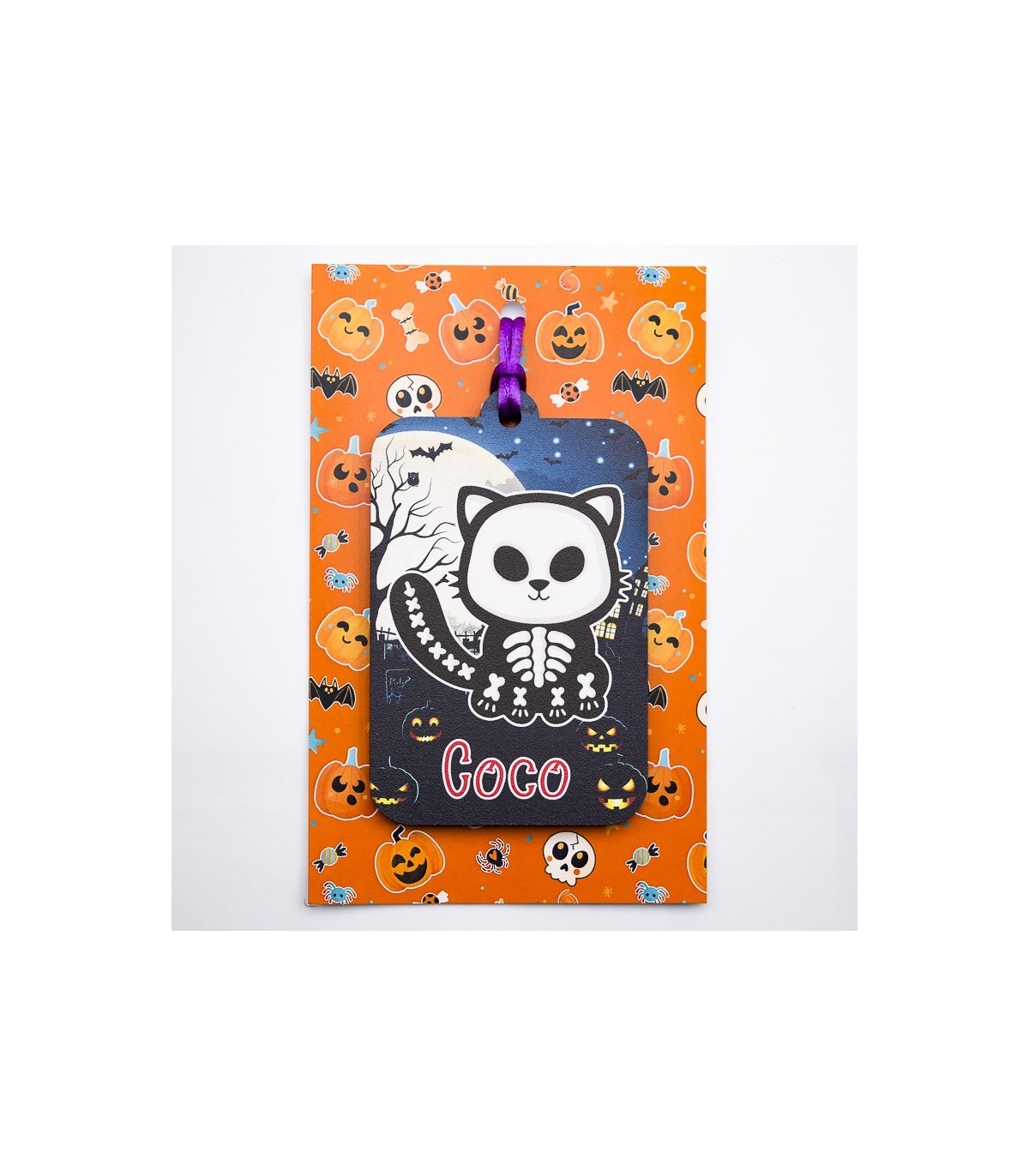 Adorno de Halloween personalizado madera impresa gato esqueleto