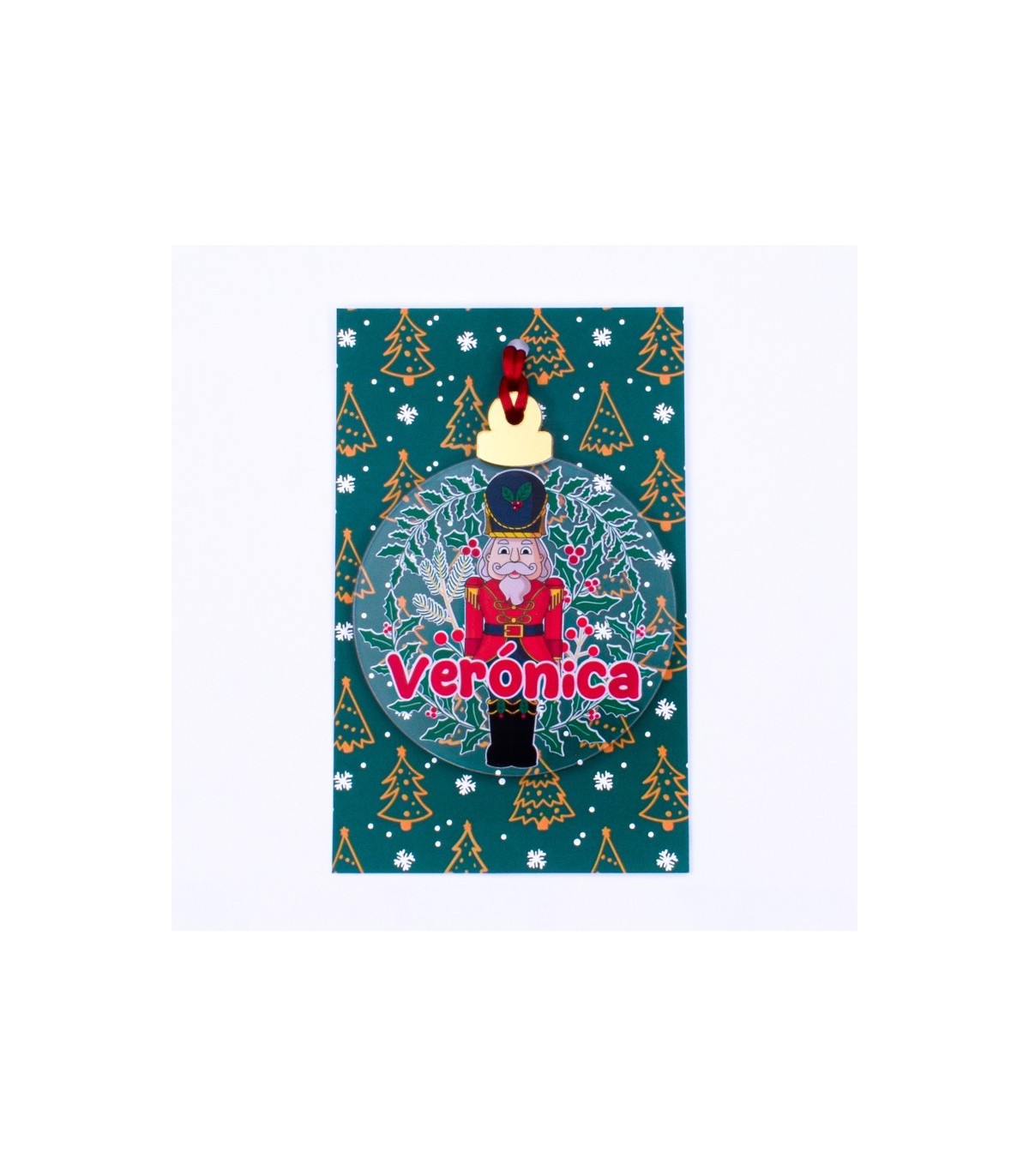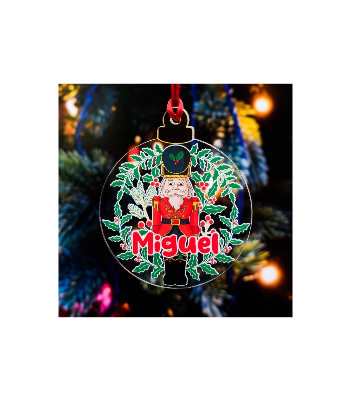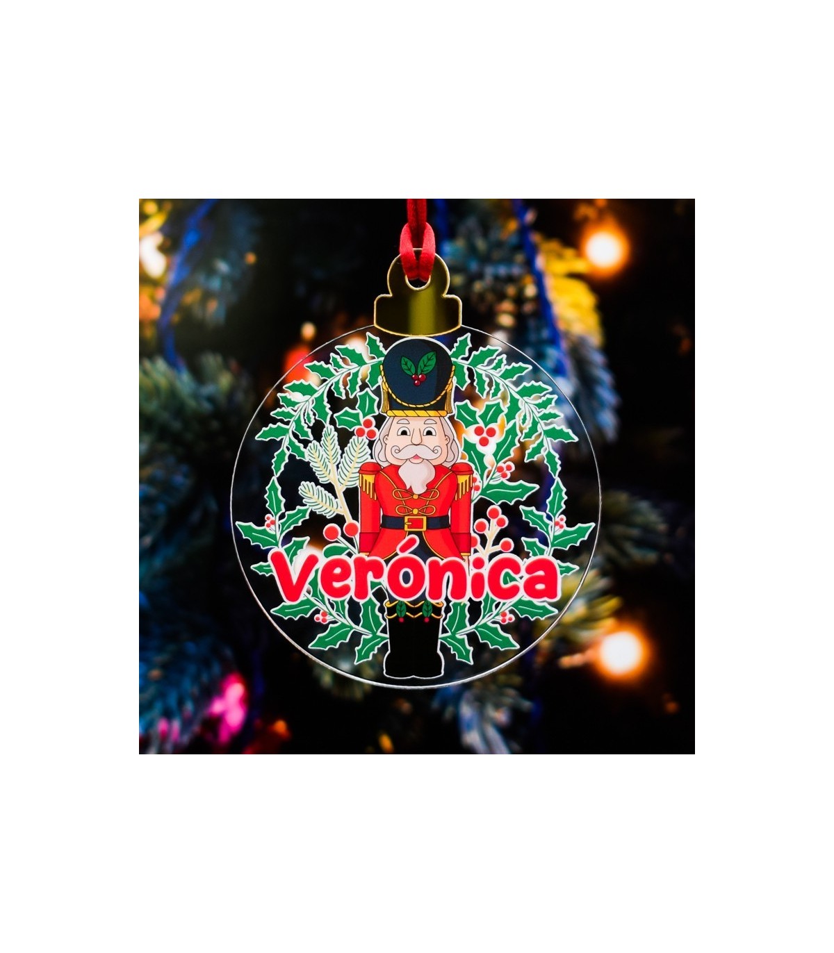 Bola realizada en metacrilato transparente contrastado por la figura del simbólico Cascanueces sobre guirnalda navideña.