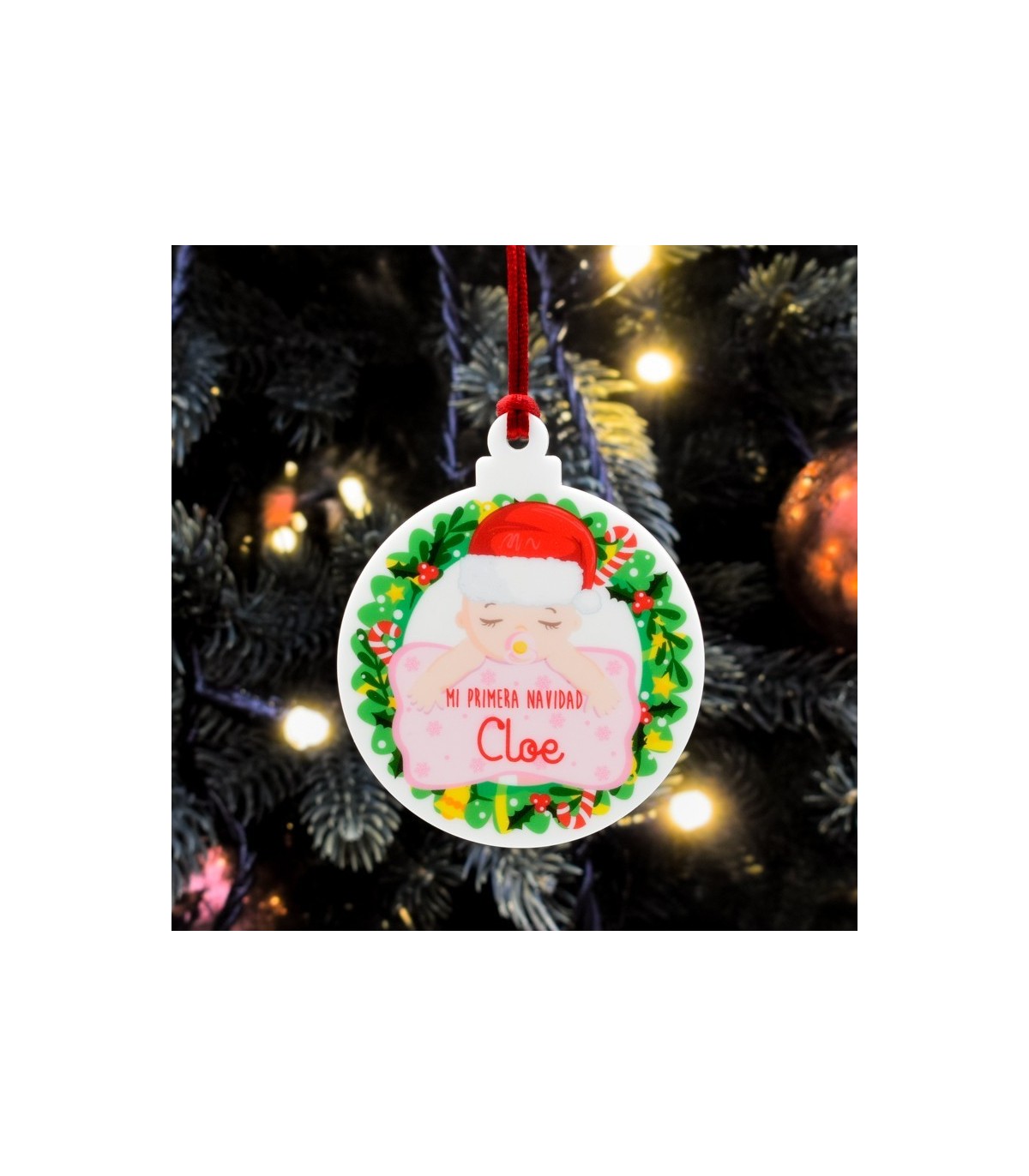 Este adorno de metacrilato blanco con un tierno diseño de bebé en mantita rosa es ideal para celebrar su primera Navidad. Incluye la personalización del nombre y un cordel de satén burdeos para colgar. Es un regalo perfecto y un recuerdo especial para decorar el árbol navideño año tras año.