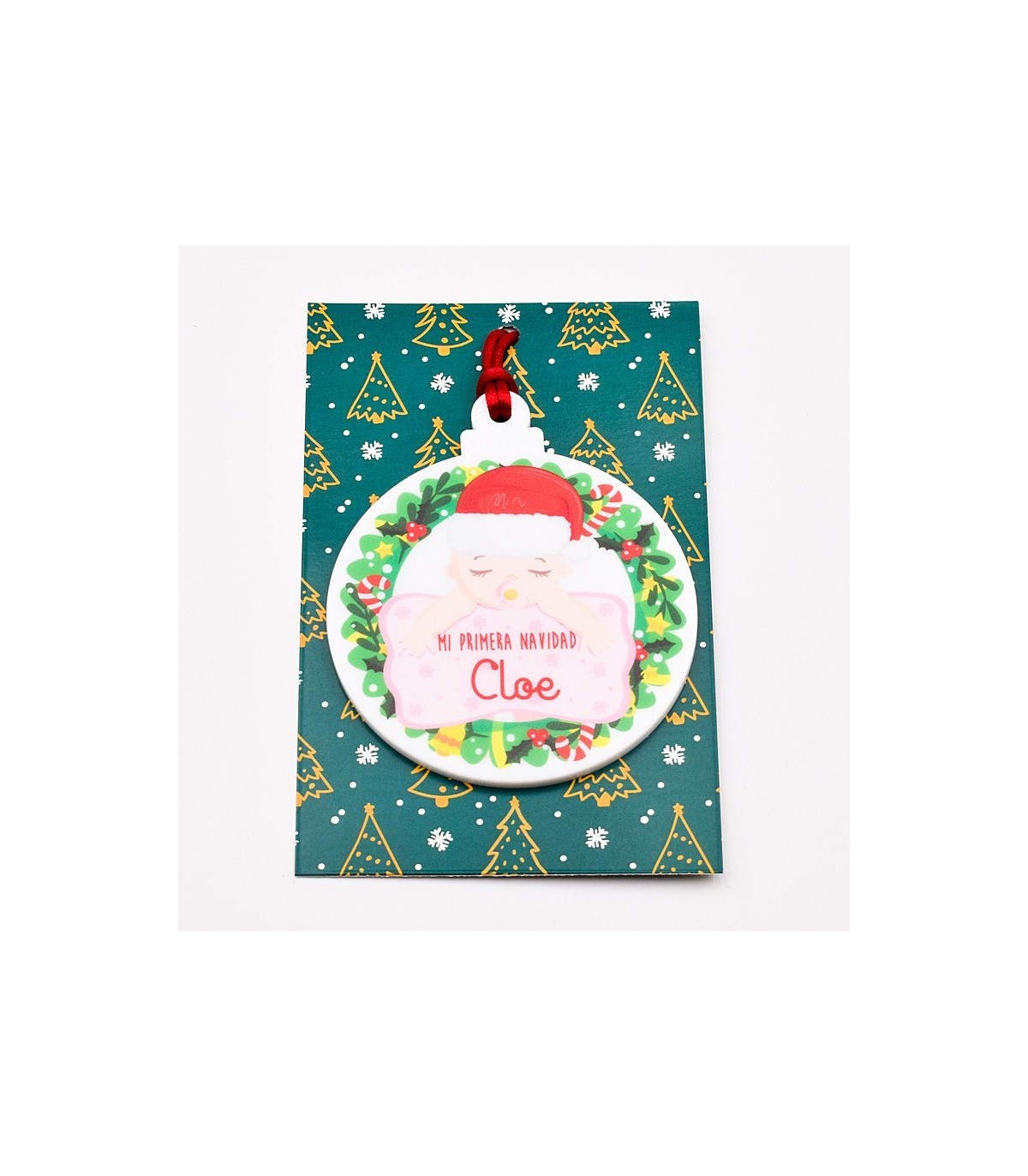 La bola de Navidad para tu bebé es perfecta para conmemorar la primera Navidad de tu pequeña. Hecha en metacrilato blanco con un diseño niña pequeña en mantita rosa, este adorno incluye la personalización del nombre para hacerlo aún más especial. Viene con un cordel de satén burdeos y una presentación en tarjeta navideña, lo que lo convierte en un regalo ideal para la familia o los abuelos.