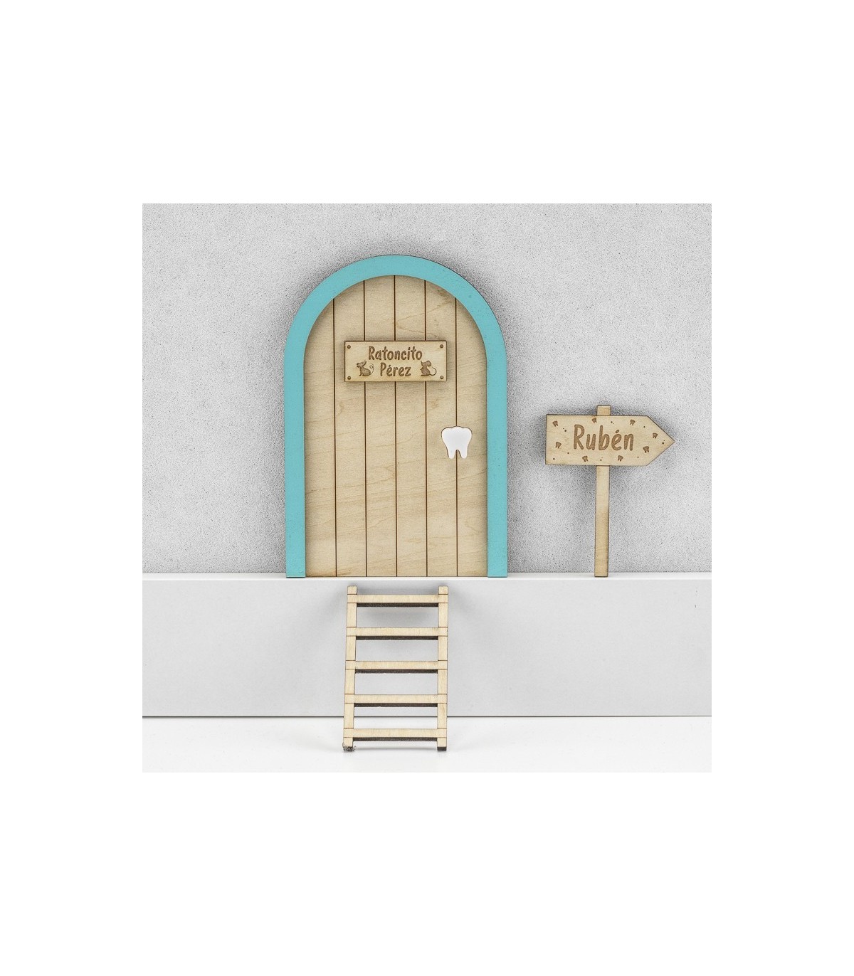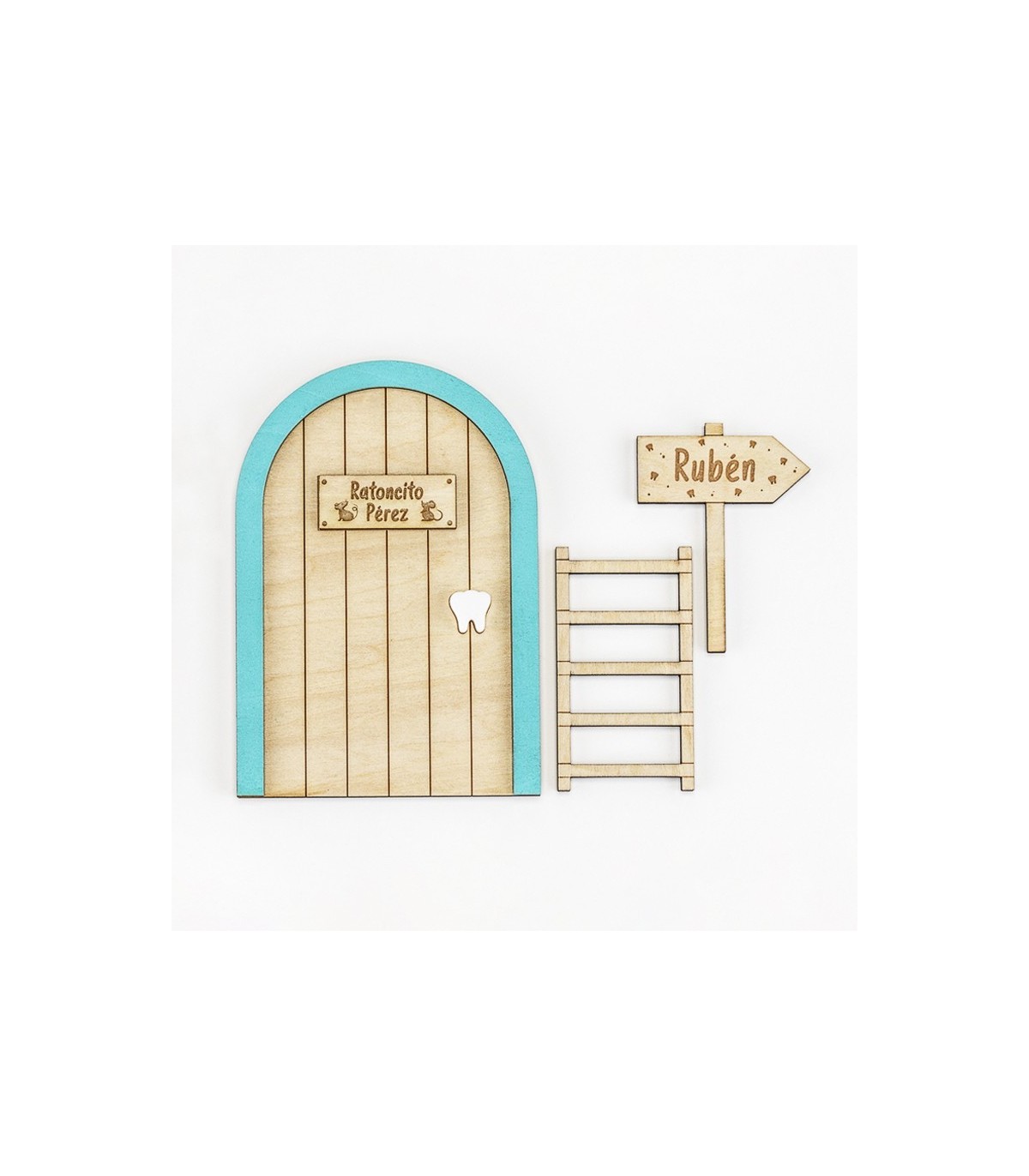Puerta fantástica para colocar encima del rodapié, con detalle en azul celeste, escalera para acceder a la puerta, y cartelito con el nombre del niño.