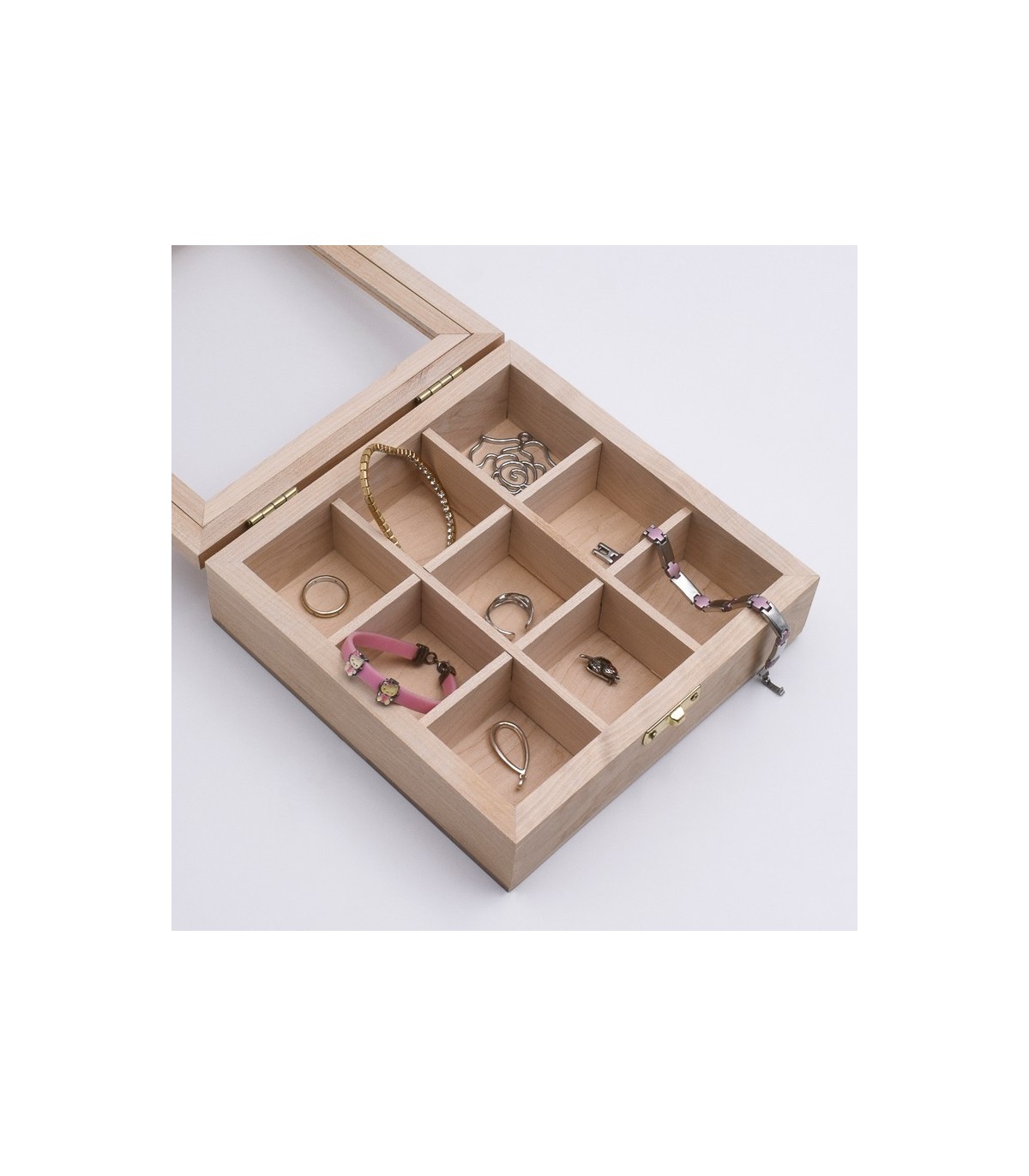 Caja cuadrada de madera de abedul de elevada calidad, y tapa de metacrilato transparente, con compartimentos para una amplia gama de usos.