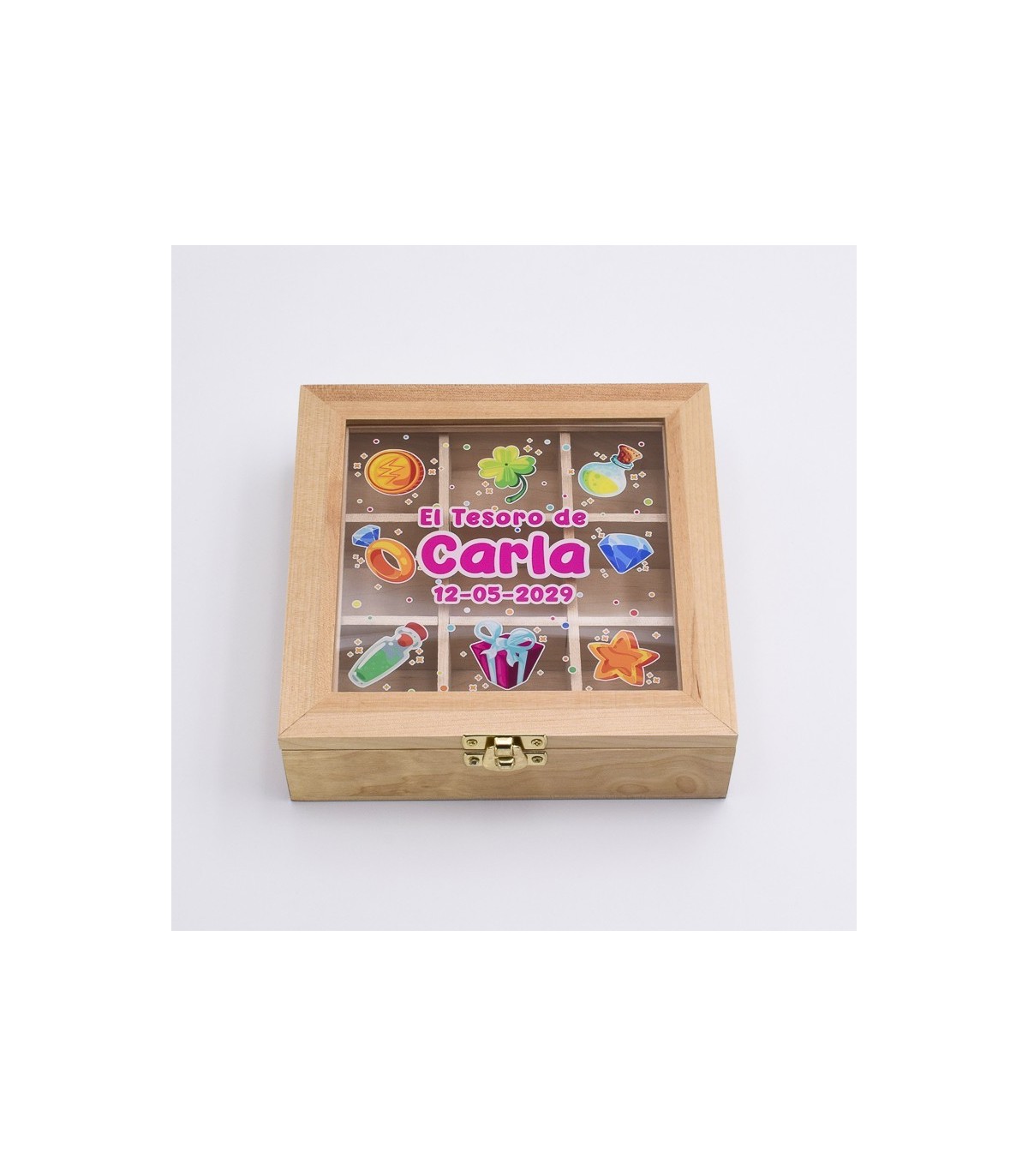 Caja de madera con nueve compartimentos, para una amplia gama de usos, personalizada con el nombre y la fecha, e inscripción "El Tesoro de".