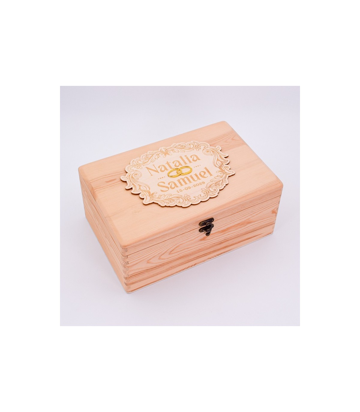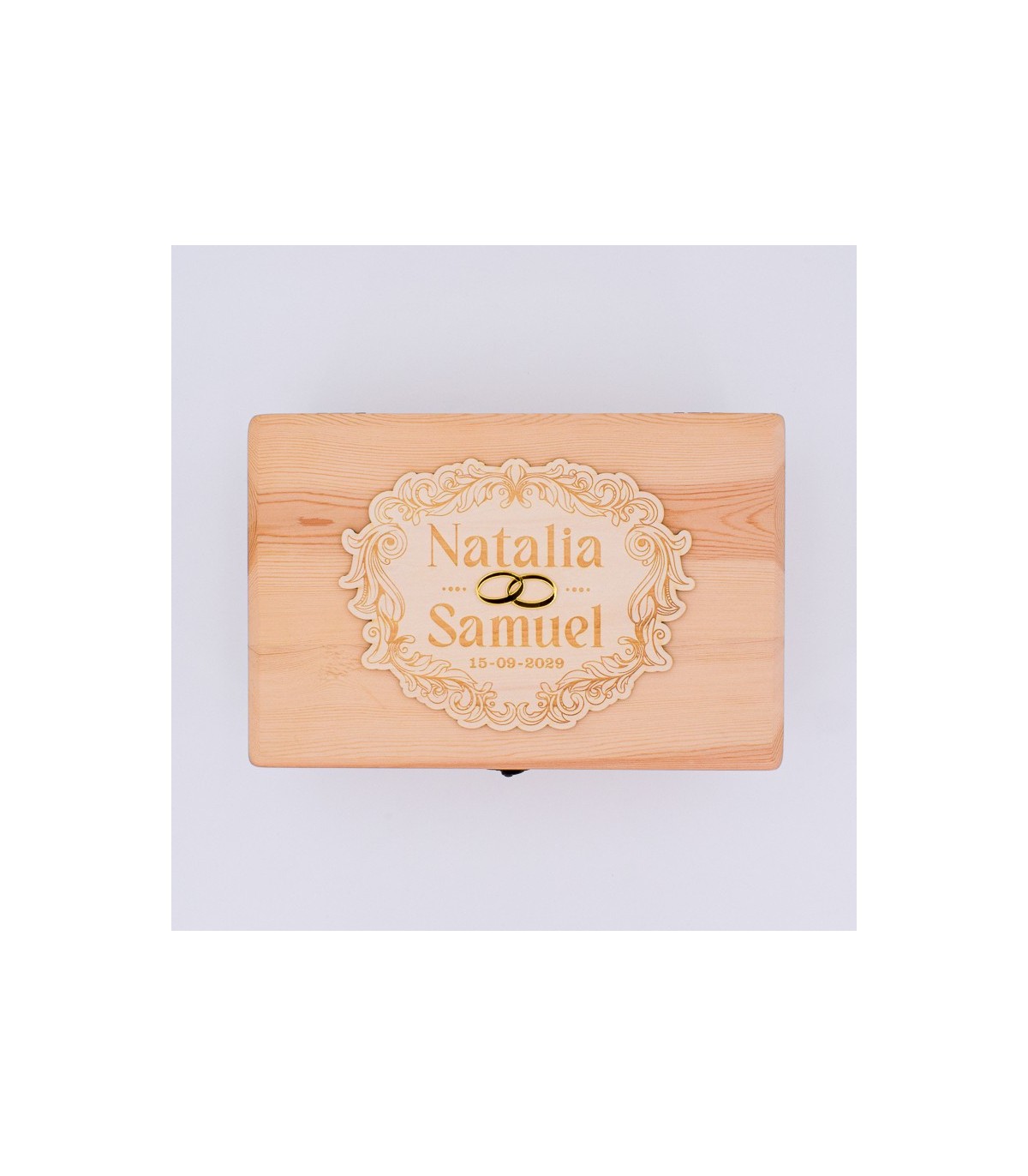 Este baúl permite grabar los nombres de los novios y una fecha importante, como el día de la boda o del compromiso. La grabación se realiza sobre una pieza decorativa de madera con forma de guirnalda, situada en la tapa, donde los nombres quedan unidos por dos anillos de aro entrelazados, evocando el símbolo del amor eterno.