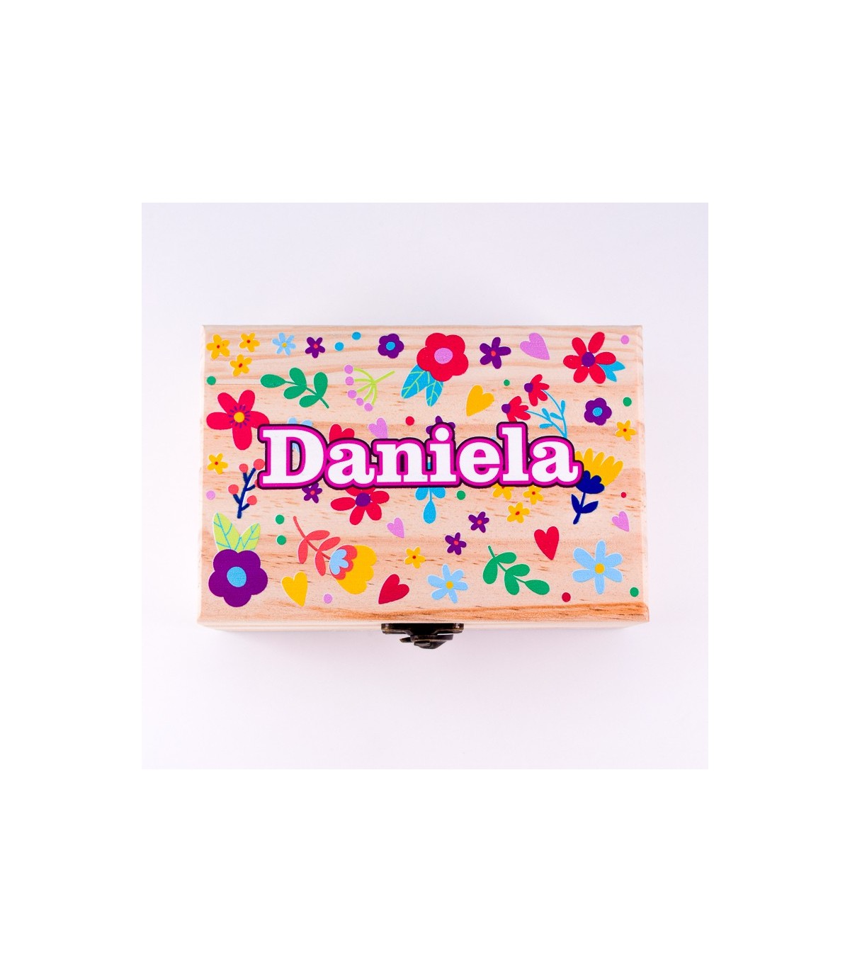 Una caja tipo joyero de madera natural, con un alegre diseño de corazones y flores en tonos vivos. Personalizada con el nombre en el centro, es perfecta para niñas o para tu amiga más divertida.