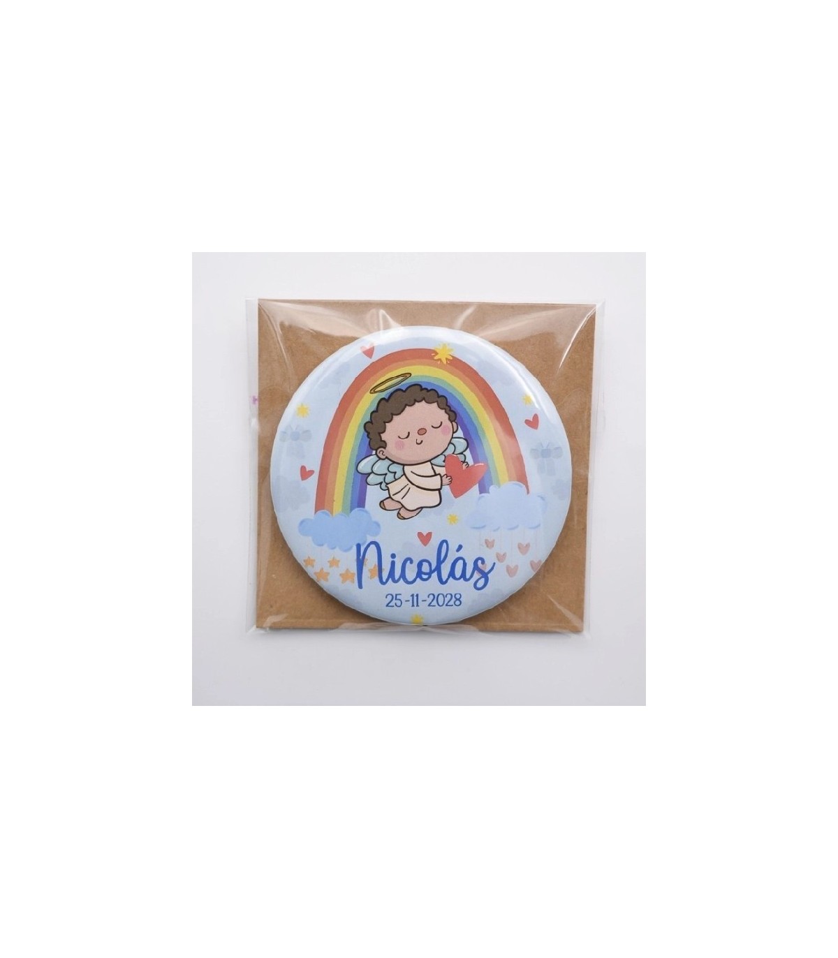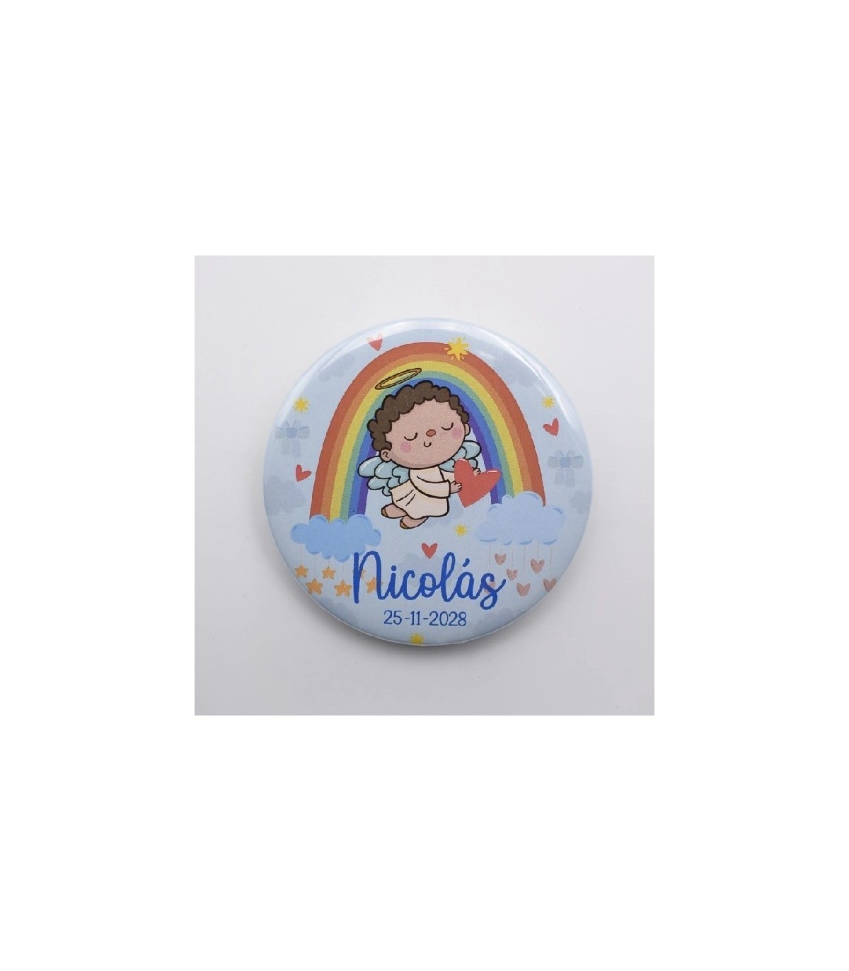 Esta chapa está decorada con un adorable angelito acompañado de un arco iris, transmitiendo dulzura y ternura. Puedes elegir entre fondo azul o rosa, según el estilo de la celebración.