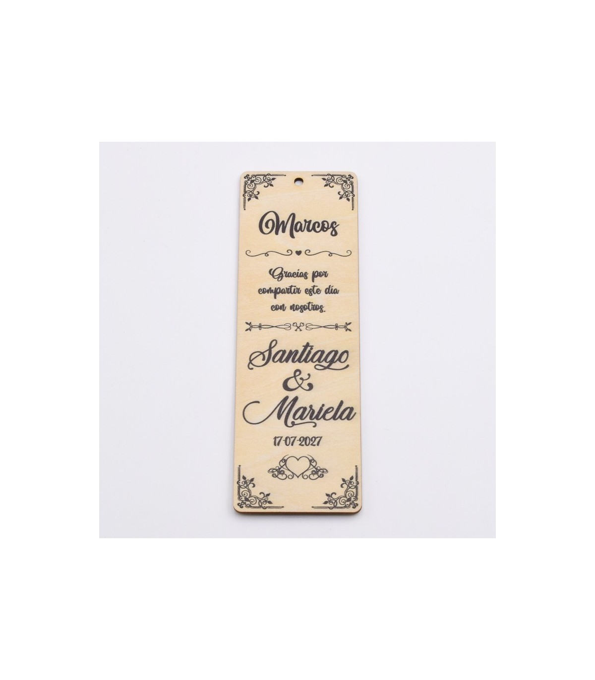Marcapáginas de madera de abedul, con inscripción "Gracias por compartir este día con nosotros".
