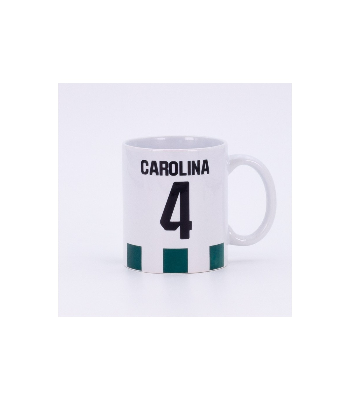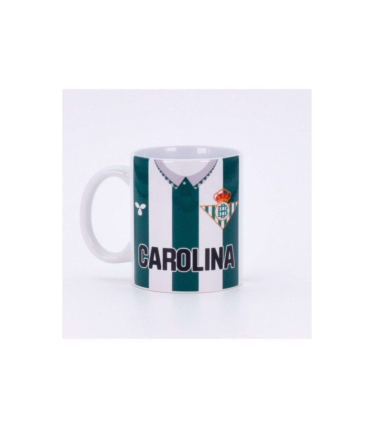 Inspirada en la icónica camiseta del Real Betis Balompié, esta taza de cerámica personalizada combina funcionalidad y sentimiento verdiblanco. Está decorada en blanco con rayas verdes, y se puede personalizar con nombre y número en color negro, en mayúsculas, como si se tratara de una equipación oficial.
