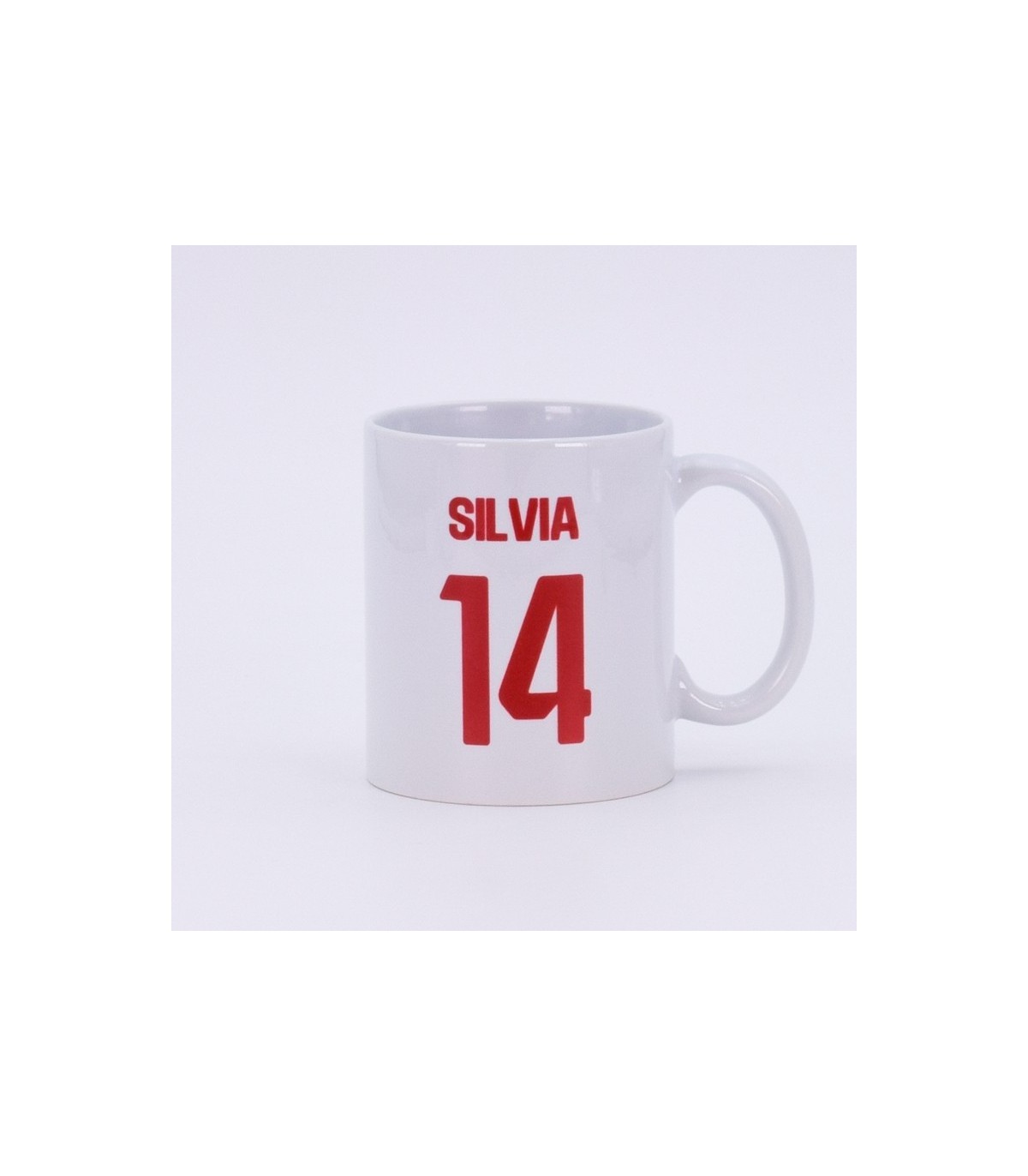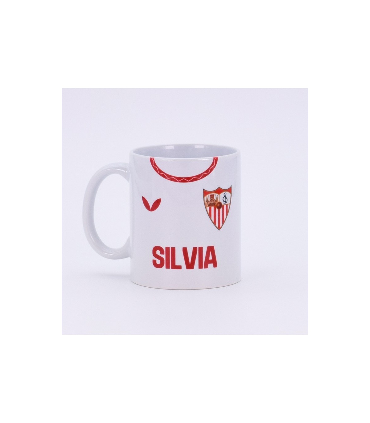Esta taza de cerámica personalizada con el diseño del Sevilla FC es perfecta para los más fieles al club. Con nombre y número en rojo sobre fondo blanco, se convierte en un detalle único, funcional y lleno de sentimiento futbolero.